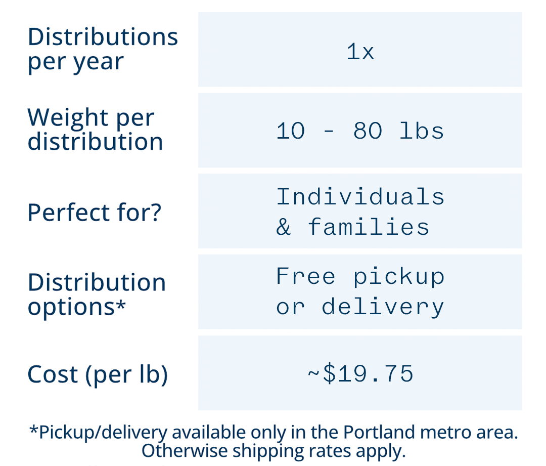 If you’re outside of our delivery area, don’t worry! We provide several pick-up days at our warehouse in Southeast Portland, or we can ship to you for an additional fee.